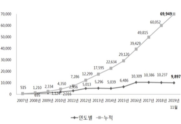 지난 2007년 처음 출시한 주택연금은 당시 515명 가입자로 시작해 2016년 1만 309명, 2017년 1만 386명, 2018년 1만 237명으로 최근 꾸준히 1만명 이상의 가입자를 기록해왔다.