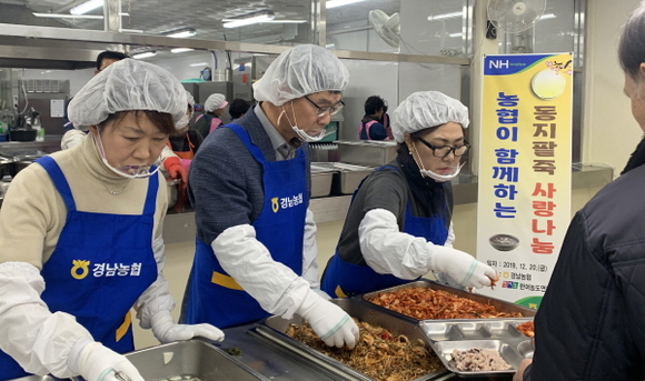 경남농협과 한국여성농업인경남연합회 회원들은 동지를 앞둔 20일 창원시 의창노인종합복지관 내 급식소에서 복지관을 방문한 지역 어르신에게 사랑의 온정을 담은 동지팥죽 나눔 행사를 가졌다고 밝혔다.