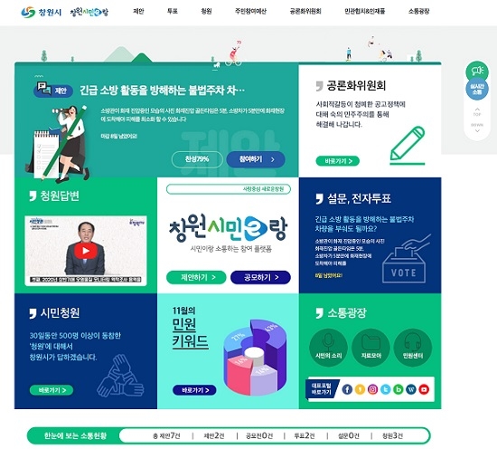 '창원시민e랑'에서 제공하는 메뉴는 △제안 △전자투표 △주민참여예산 △시민청원 △공론화위원회 △민관협치 △소통광장 7개 분야 30개 항목으로, 온라인소통창구를 일원화 및 시 주요정책에 대한 참여와 토론기회를 확대하고, 결재원문정보 등을 통합제공함으로써 정보서비스를 한층 업그레이드했다.