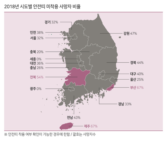 지역별로 살펴보면 2018년에 안전띠 미착용으로 인한 사망자 비율이 가장 높은 곳은 부산과 제주로 나타났으며, 그다음으로는 전북이 높게 나타났다.