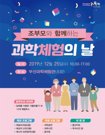 박현준 부산시과학교육원장은 “이번 행사는 조부모의 손자, 손녀 교육 역할을 제고하고 아이들의 인성 함양에도 도움이 될 것”이라고 전했다.