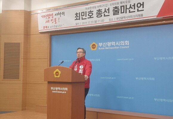 최민호 사하발전포럼 대표가 23일 오전 11시 부산시의회 브리핑실에서 기자회견을 열고 자유한국당 소속으로 부산 사하갑 지역구에 내년 총선 출마한다고 선언했다.