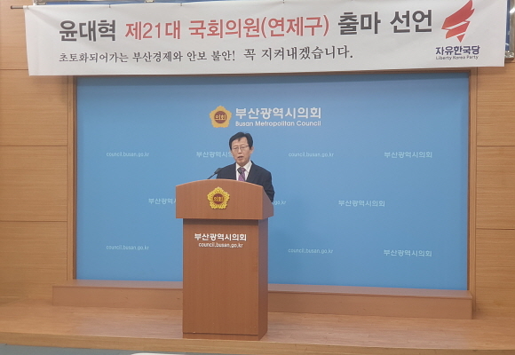 윤대혁 자유한국당 서민경제분과부위원장이 23일 부산시의회 브리핑실에서 기자회견을 열고 내년 국회의원 선거(총선) 연제구 지역구에 출마할 뜻을 밝혔다.