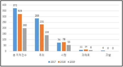 3년간 행정처분 추이를 살펴보면 `17년 372건, 지난해 323건, 올해 200건으로 지적건수가 현저히 줄고 있다.