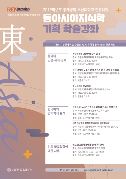 인문대학은 부산대 교수·강사 및 외부 저명 연사를 초청해, 동아시아지식학을 기본 테마로 유라시아까지 시야를 넓혀 여러 문명권의 언어·사상·역사·문명 등을 들여다볼 수 있는 60개 이상의 다양한 강좌를 제공한다.