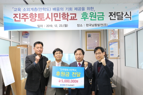 교육기부를 위해 노력해 온 남동발전은 폐교 위기의 야학시설인 진주향토시민학교를 살리기 위해 2015년부터 정기적인 후원을 약속하고 매년 500만 원을 전달하고 있다.