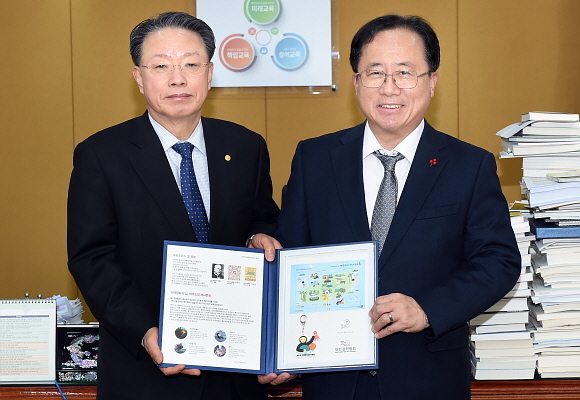 김석준 부산시교육감(오른쪽)이 지난 23일 오후 시교육감실에서 김동헌 대한결핵협회 부산시지부회장에 크리스마스 씰 성금을 전하고 김 회장에게 씰을 전달받은 뒤 기념촬영하고 있다. (사진=부산시교육청 제공)