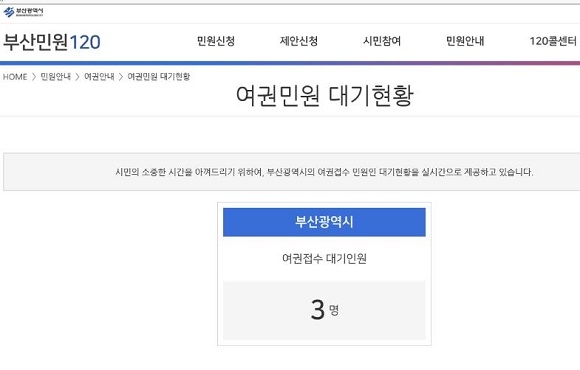 해당 서비스는 시 홈페이지 ‘부산 민원 120’에서 현재 시범 운영 중으로 내달부터 시와 사하구의 ‘여권 민원 대기현황 실시간 제공’ 서비스를 해당 페이지와 ‘시 통합민원서비스 QR코드’로 확인할 수 있다.