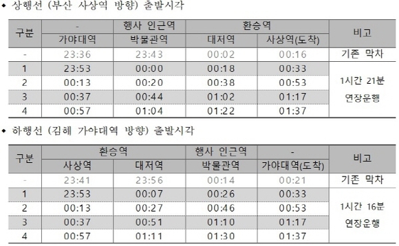 상행선(부산 사상역 방향)은 기존 막차시간 보다 1시간 21분 연장해 가야대역 00:57에 마지막 열차가 출발한다. 하행선(김해 가야대역 방향)은 기존 막차시간보다 1시간 16분 연장해 사상역 00:57에 마지막 열차 탑승이 가능하다.