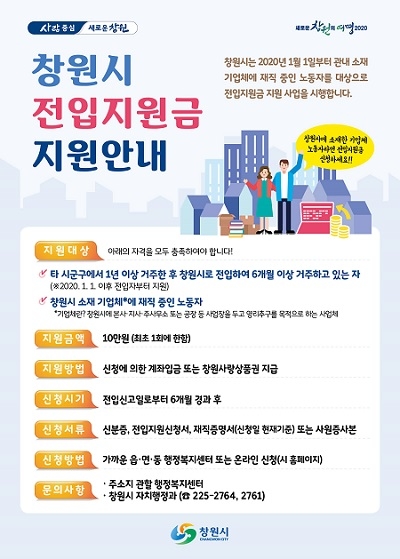 이 사업은 전입신고 일을 기준으로 1년 이상 타 시군구에 거주 중이던 노동자가 창원시 관내로 전입해 6개월 이상 실 거주하였을 때 지원 신청이 가능하며, 이는 관외 거주 노동자가 창원시로 거주지를 이전하여 인구 증가에 기여해 인센티브를 지급하고자 하는 것이다.
