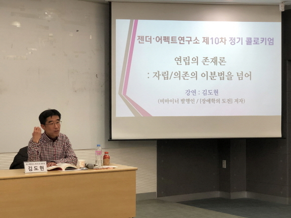 지난달 26일 열린 콜로키엄에선 장애인 언론 ‘비 마이너(Be Minor)’ 발행인이자 2019년 우수출판콘텐츠제작지원사업 선정작인 ‘장애학의 도전’ 저자 김도현 대표를 초청해 강연을 들었다.
