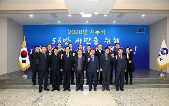 경남 김해시는 2일 오전 시청 대회의실에서 허성곤 시장을 비롯한 전 직원이 참석한 가운데 2020년 시무식을 갖고 경자년 새해 업무를 시작했다.