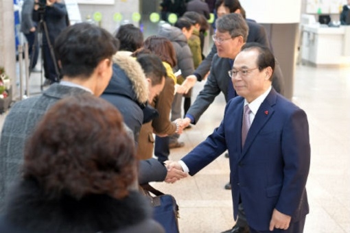 이날 오거돈 시장은 1층 로비에서 출근하는 직원들과 일일이 악수하고 새해 인사를 전한 뒤 오전 9시 집무실에서 온라인 영상으로 신년 메시지를 전했다.