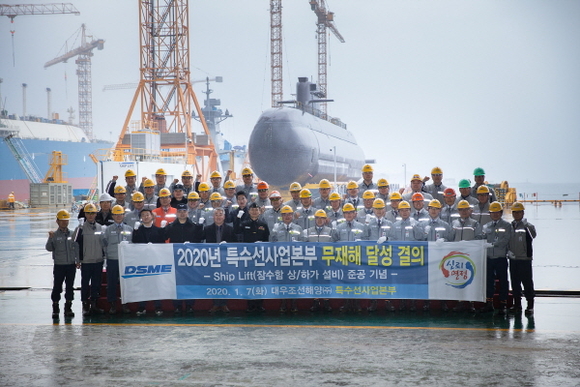 대우조선해양은 특수선본부 안벽에서 ‘2020년 특수선사업본부 무재해 달성 결의대회 및 Ship Lift(잠수함 상·하가 설비) 준공식’을 가졌다고 7일 밝혔다. 이날 행사에는 대우조선해양 이성근 사장, 방위사업청 한국형 잠수함 사업단장 조동진 준장, 도산 안창호함장 김형준 대령 등 내외 관계자 50여 명이 참석했다.
