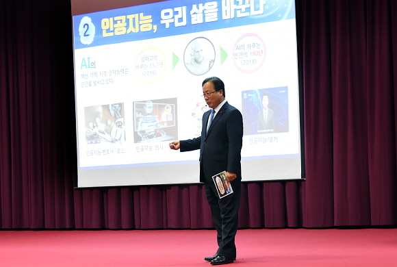 김석준 부산시교육감이 8일 오전 10시 30분 부산교육연수원에서 유치원·중등 2급 정교사를 대상으로 ‘교육의 미래는 현장에 있다’를 주제로 특강을 하고 있다. 이날 부산교육연수원에서는 유치원·중등 2급 정교사 234명이 참석한 가운데 ‘2020년 겨울 유치원·중등 1급 정교사 자격연수과정’이 열렸다. (사진=부산시교육청 제공)