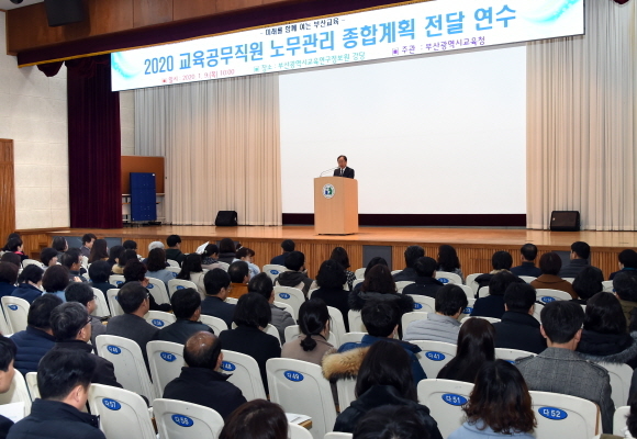 9일 오전 10시 부산교육연구정보원에서 ‘교육공무직원 관리 종합계획 전달 연수’가 열린 가운데 김석준 부산시교육감이 공립단설유치원, 초, 중, 고, 특수학교 각 행정실장 앞에서 인사말을 전하고 있다.