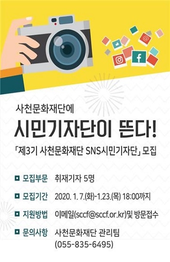 사천문화재단은 2020년도에 추진하는 주요사업과 문화예술현장을 취재하고 기사 및 시각·영상콘텐츠로 작성해 SNS 및 블로그 등으로 생생하게 전달하는 홍보대사 역할을 할 '제3기 사천문화재단 SNS시민기자단'을 모집한다.