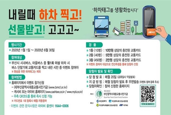 이번 행사는 부산 시내·마을버스 하차 시 버스 단말기에 교통카드를 찍고 내린 시민 가운데 행사 참여자를 대상으로 추첨을 통해 매달 총 500명에게 금액이 충전된 교통카드를 증정한다.