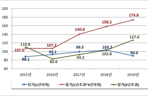 만기구조별로는 1년 이하 단기채권이 90조원 발행돼 전년대비 13.2%(13조 7000억원) 감소했다. 반면 1~3년 이하 중기채권은 173조 8000억원, 3년 초과 장기채권이 127조원 발행돼 각각 9.9%, 23.5%씩 증가하는 모습을 보였다.