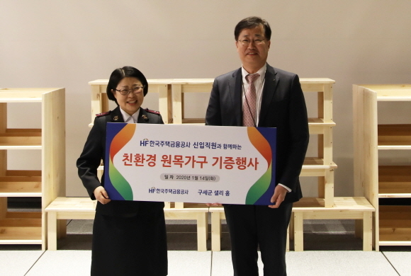 지난 14일 부산 남구 문현동 아바니 센트럴에서 한국주택금융공사(주금공) 정재선 상임이사(오른쪽)가 현은숙 구세군 샐리 홈 센터장에 친환경 원목가구를 전달한 뒤 기념촬영하고 있다.
