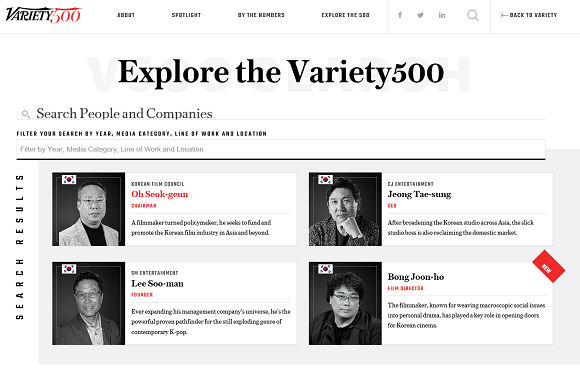 이번 500인 가운데 한국인은 봉준호 감독과 오석근 위원장, 이수만 SM엔터테인먼트 회장, 정태성 전 CJ엔터테인먼트 영화사업부문 대표 총 4명이 선정됐다.