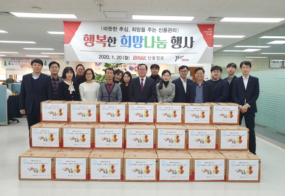 BNK신용정보가 20일 오전 설 명절을 앞두고 범일동 본사에서 지역 취약계층 50가구에 생필품, 식료품 등을 담은 ‘희망 나눔 꾸러미’를 전달하는 행사를 진행했다고 밝혔다.