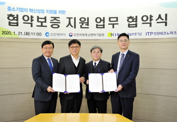 기술보증기금(기보)이 21일 인천 미추홀타워에서 인천시, 인천지방중소벤처기업청(인천중기청), 인천테크노파크와 함께 ‘협약보증 지원 협약’을 체결했다고 밝혔다.