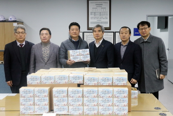 남기찬 부산항만공사(BPA) 사장(왼쪽 네 번째)이 설 명절을 앞둔 22일 오전 부산항 근로자들을 찾아 격려하는 시간을 보낸 가운데 설맞이 떡을 전달하며 직원들과 기념촬영하고 있다. 이날 남기찬 사장은 부산항 종합상황실, 북항 초소, 항운노조, 항만 연관산업 총연합을 비롯한 항만현장 근로자들을 만나 격려했다. (사진=부산항만공사 제공)