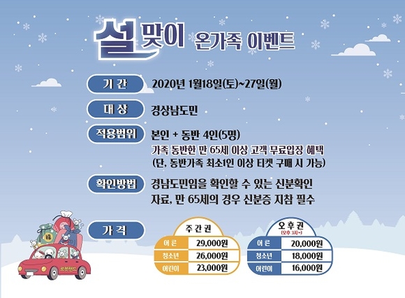 경남 마산로봇랜드가 설연휴를 맞아 최대 30% 할인과 가족동반 만 65세 이상 어르신 무료입장이 가능한 온가족 할인 이벤트를 진행한다.