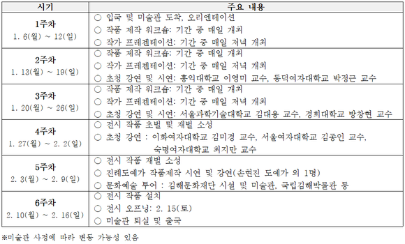 작가들은 38일간 세라믹창작센터에서 머무르며 작품 제작, 작가 프레젠테이션, 강연 및 비평, 초청 강연, 전통 기법 시연, 문화예술 투어 등 다채로운 프로그램에 참여한다. 초청 강연에는 서울과학기술대학교 김대용 교수, 홍익대학교 이영미 교수, 동덕여자대학교 박정근 교수, 경희대학교 방창현 교수, 이화여자대학교 김미경 교수, 서울여자대학교 김종인 교수, 숙명여자대학교 최지만 교수가 도자와 예술에 관해 작가들에게 강의를 펼친다.