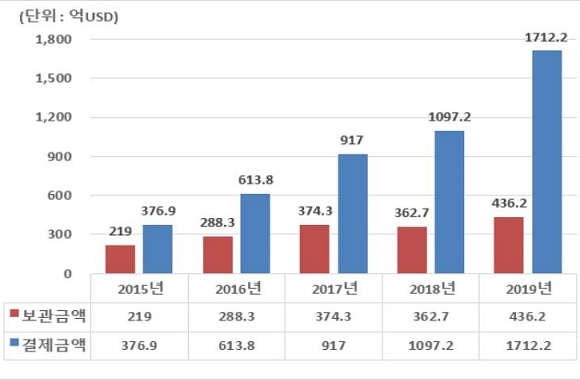 한국예탁결제원은 ‘2019 외화증권 보관·결제금액 현황조사’ 결과를 29일 발표하고 결제금액은 1712억 2000만 달러, 보관금액은 436억 2000만 달러라고 밝혔다.