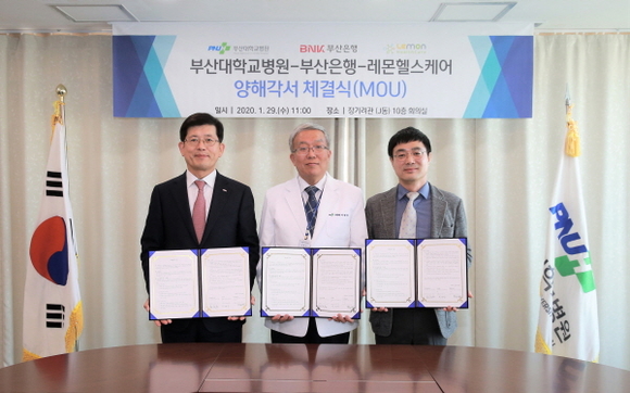 부산대학교병원은 부산은행과 레몬헬스케어와 함께 ‘의료·금융 융합 서비스 플랫폼 구축’을 위한 3자 간 업무협약(MOU)을 29일 부산대병원에서 체결했다고 29일 밝혔다.
