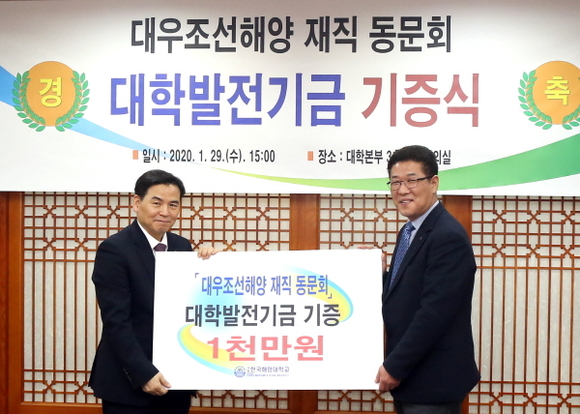 한국해양대학교는 대우조선해양 한국해양대 동문회가 대학발전기금 1000만원을 29일 오후 대학본부 3층 정책회의실에서 전달했다고 밝혔다.