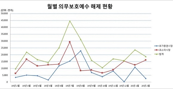 올 2월 중 의무보호예수가 해제되는 주식 수량은 전월대비 20.6%(4837만주) 감소한 수치이며 전년동월대비로 보면 91.1%(8906만주) 증가했다.