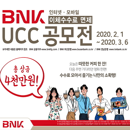 BNK금융그룹이 ‘인터넷·모바일 뱅킹 이체 수수료 면제’를 주제로 내달 6일까지 UCC 공모전을 진행하고 있다고 5일 밝혔다.