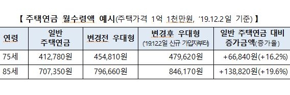 주금공은 주택연금 활성화 방안(경제활력대책회의)의 후속조치로 지난해 12월 2일부터 ‘우대형 주택연금’에 신규로 가입하는 신청자의 월 수령액을 일반 주택연금보다 최대 20% 더 지급하고 있다.