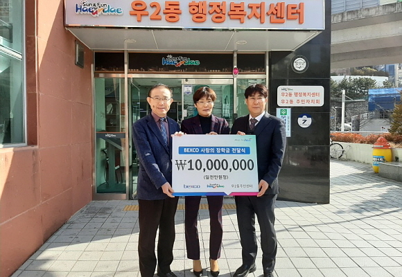 벡스코가 7일 부산시 해운대구 우2동 주민센터에 ‘꿈나무 지원사업’을 위한 장학금 1000만원을 전달했다고 밝혔다.