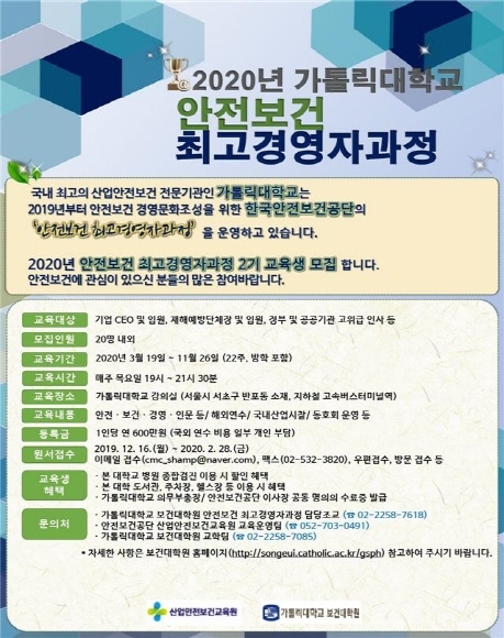 안전보건 최고경영자과정은 안전보건을 기업경영의 필수 전략요소로 하는 경영 마인드를 구축해 급변하는 기업 환경에 대해 효과적으로 대처하고 조직 내 자율안전보건관리 기반을 조성하고자 운영하고 있다. 현재 주관대학별로 3월 중순 개강을 목표로 교육생을 모집 중이다.