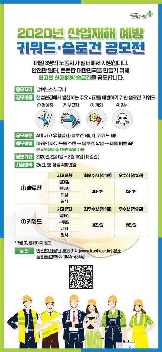 이번 공모전은 4대 악성 사고사망(추락, 끼임, 충돌, 질식) 유형별로 예방 키워드 또는 슬로건에 각각 제안 가능하다.