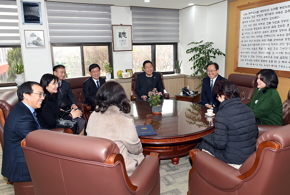 지난 10일 오전 교육감실에서 ‘제5대 감사자문위원회 위원 위촉장 수여식’이 열린 가운데 김석준 부산시교육감이 위촉장을 전달한 뒤 위원들과 교육청 감사에 대한 의견을 나누고 있다.