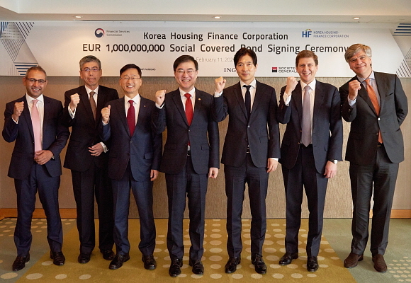 11일 부산시 해운대구 웨스틴조선호텔에서 ‘한국주택금융공사(주금공) 해외 커버드본드 발행 인수계약식’이 열린 가운데 이정환 주금공 사장(왼쪽 세 번째)이 서명 후 참석자들과 기념촬영하고 있다. 이날 행사에는 금융위원회 손병두 부위원장, 부산시 박성훈 경제부시장 등이 참석했다. 지난달 주금공은 아시아 최초로 마이너스 금리 커버드본드의 발행에 성공한 바 있다. (사진=한국주택금융공사 제공)