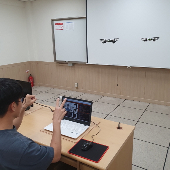 학생들이 지도교수인 정순호 교수와 멘토인 임베디드시스템 관련기업 ‘엣지아이랩’ 박정석 대표의 도움을 받아 개발한 시스템은 카메라로 사용자의 손동작을 인식한다. 인식한 정보를 서버에서 명령 신호로 바꿔 드론에 전달하면 드론이 신호에 맞는 동작을 수행하도록 설계됐다.