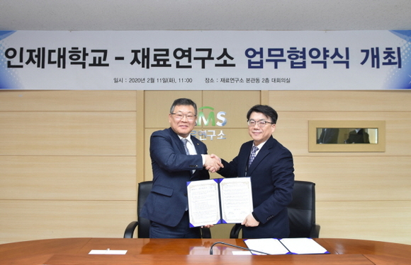 인제대학교는 재료연구소와 11일 재료연구소 본관 대회실에서 양 기관의 우수한 연구개발 역량을 활용해 공동연구와 성과 창출을 활성화하기 위한 업무협약을 체결했다고 밝혔다.