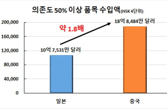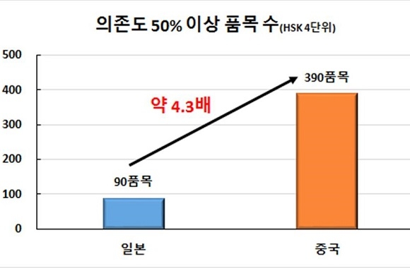 이 가운데 대중국 수입의존도가 50% 이상인 고의존도 품목도 390종으로 전체 중국 수입품목의 37%에 달했으며 이들의 수입금액은 이보다 더 높은 48.3%다. 특히 52개종은 100% 전량 중국에서 수입되고 있는 상태다.