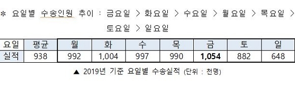 요일별로는 이용객이 가장 많은 날은 일평균 105만 4000명인 금요일로 집계됐다. 다음으로 화요일이 1000만 4000명으로 뒤를 이었으며 반면 일요일은 하루 평균 64만 8000명으로 가장 적었다.