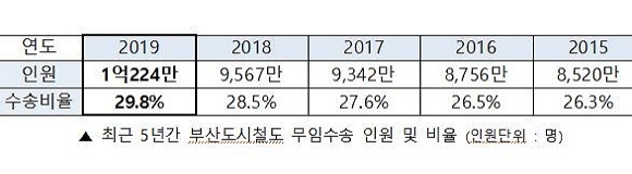 반면 지난해 부산도시철도 무임수송 비율은 29.8%에 이르렀다. 일 평균으로 28만명, 한 해로 보면 1억 224만명으로 연인원이 1억명을 넘긴 것은 이번이 처음 있는 일이다.