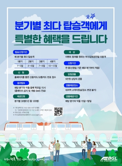 한편 이벤트에 관한 자세한 사항은 부산김해경전철 홈페이지에서 확인 가능하며, 전략기획팀으로 문의하면 된다.