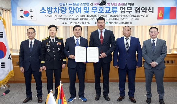 경남 창원시는 17일 시정회의실에서 몽골 소방청과 소방차량 양여 및 우호교류 업무협약식을 가졌다.