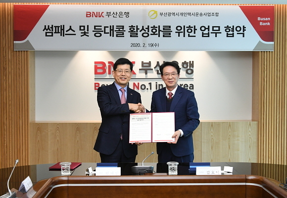 BNK부산은행이 19일 오전 부산은행 본점에서 부산시개인택시운송사업조합과 ‘썸패스, 등대콜 활성화를 위한 업무협약’을 체결했다고 밝혔다.