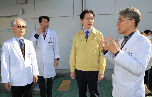 김 지사는 19일 진주시 소재 경상대학교병원을 방문한 자리에서 윤철호 병원장 등 의료진과 도 복지보건국장 등 관계자들에게 “대구에서 추가 확진자가 대거 확인돼 지역사회 감염에 대한 도민들의 불안이 크다”며 이같이 말했다.